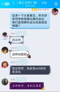但真正的上课效果会怎样呢?上课前的那天晚上,学生们热心地在班级QQ群里分享了其他老师上课的各种好方法、好形式,有的学生还专门私信我,告诉我怎么使用一些教学软件。感动之余,我对自己的授课方式又产生了动摇,不知道学生会否喜欢。第二天,我心怀忐忑地上完了第一次网课,再问学生,四个班级无一例外地回复:“陈老师,就这样上!”