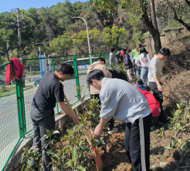 首先,邹老师带领同学们将劳动工具和需要种植的法冬青树苗运到种植地点,然后在邹老师的组织下,同学们2-3人结成小组,主动请教后勤工作人员的种树技巧,“Z字形挖坑,深度要埋过树苗根部,填好土后用脚把土夯实……”后勤工作人员耐心讲解,同学们认真学习。植树活动进行得如火如荼,邹老师和同学们都投身其中,各小组分工明确、相互协作,大家在阳光下挥洒汗水,畅快交流劳动实践经验,春风里荡起了欢声笑语。经过大家一个小时的共同努力,一百多颗小树苗整齐地排列在东区东北门旁的山坡上,亭亭的小树苗在阳光下熠熠生辉。