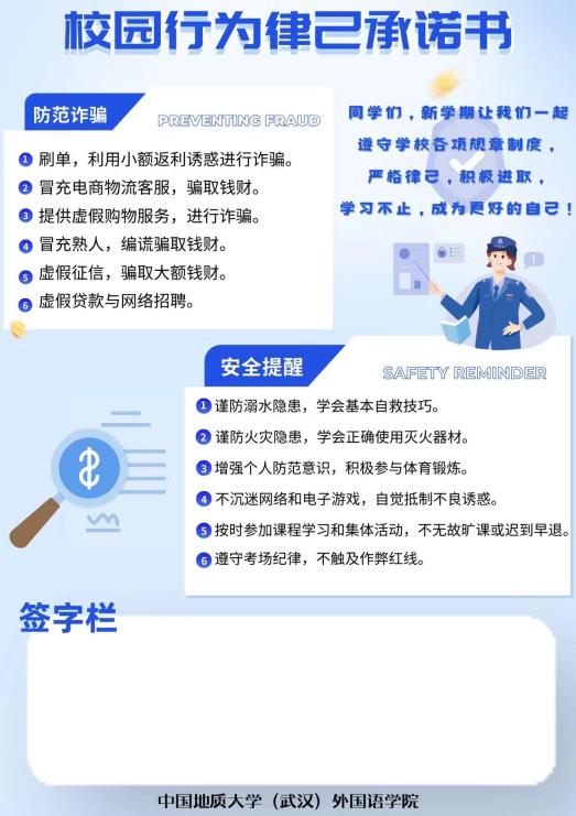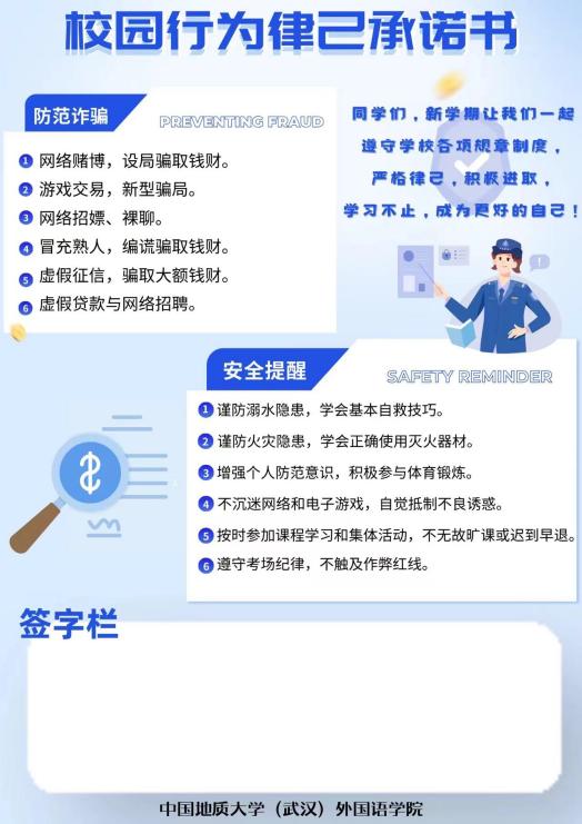 精心策划并开展以“寓教于寝,反诈同行”为主题的校园律己行为承诺书发放活动。