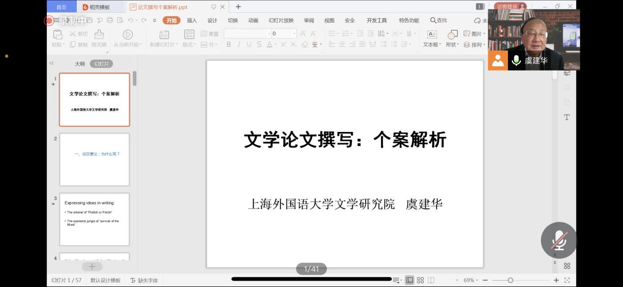 杨红燕副院长发言,介绍了虞教授的学术背景。虞教授是上海外国语大学英语教授,博士生导师,教育部英语专业指导委员会委员,中国英汉语比较研究会副会长,在语言文学研究领域成果丰硕,著有《20部美国小说名著评析》《新西兰文学史》等等。随后,虞教授简单阐述了写论文和做科研的意义和价值所在,并通过了详尽的实例来讲述文学论文的写作的技巧和细节。讲座主要分为三部分。