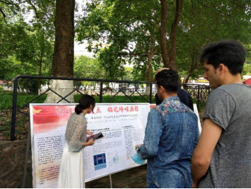 同学的英文讲解,仔细阅读展板内容。双语展览的形式很特别,这样的活动友好地将我们的红色文化历史介绍给了留学生,这也是我们文化自信的体现,十分有意义。”
