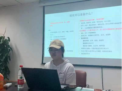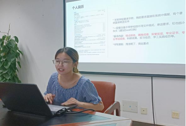 研究生的大四英语系学姐吴妮蔓分享经验。她简要介绍了学校推免政策和相关要求,并向同学们分享了她的推免历程和准备工作。她鼓励同学们要找准方向、学会沉淀、找到自己和别人的差距,多看重自己学到了什么、付出了多少、收获了什么,用坚持和坚韧迎来厚重芬芳。