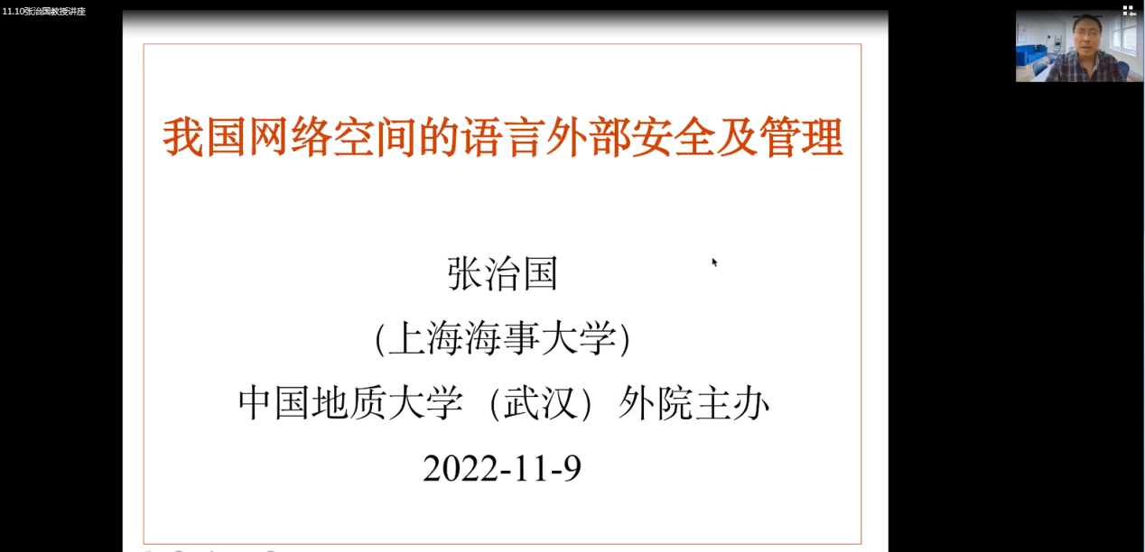 张教授讲座从问题的提出,网络空间语言外部安全的理论探讨,我国网络空间语言外部安全的表现,我国网络空间语言外部安全的管理,以及结语和延伸研究五个方面展开。