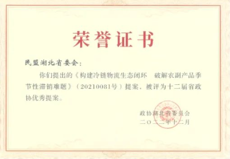 秦屹副教授执笔撰写的“构建冷链物流生态闭环,破解农副产品季节性滞销难题”提案被评为十二届省政协优秀提案。该提案源于国药控股湖北有限公司副董事长马占军负责的课题、秦屹执笔撰写的调研报告,后作为集体提案在2021年省政协十二届四次会议上由民盟湖北省委提交。