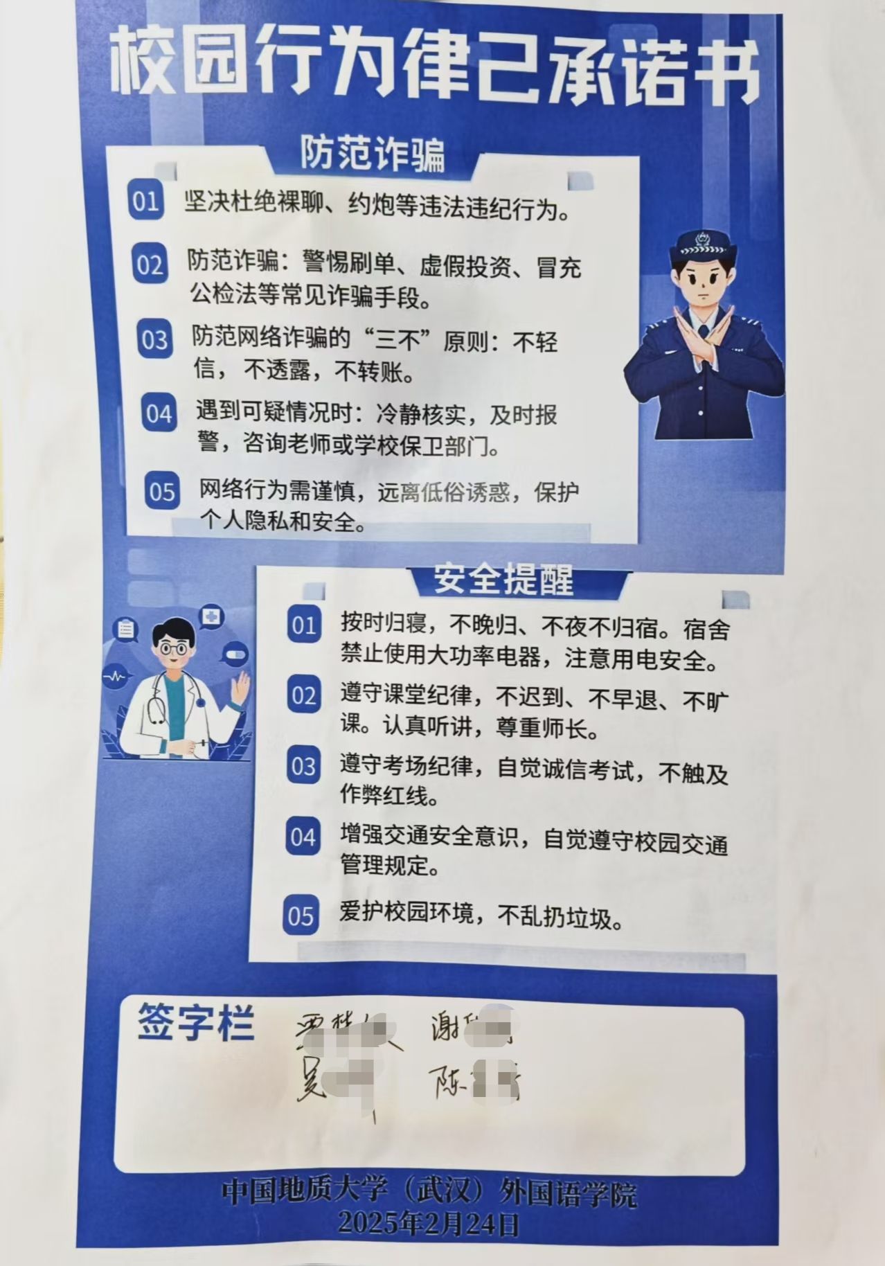 特别制作电动车消防安全提示,以宿舍为单位开展电动车安全承诺接力活动。各宿舍集体学习电动自行车充电规范后,在提示条上签署姓名,实现安全责任“到寝到人”。