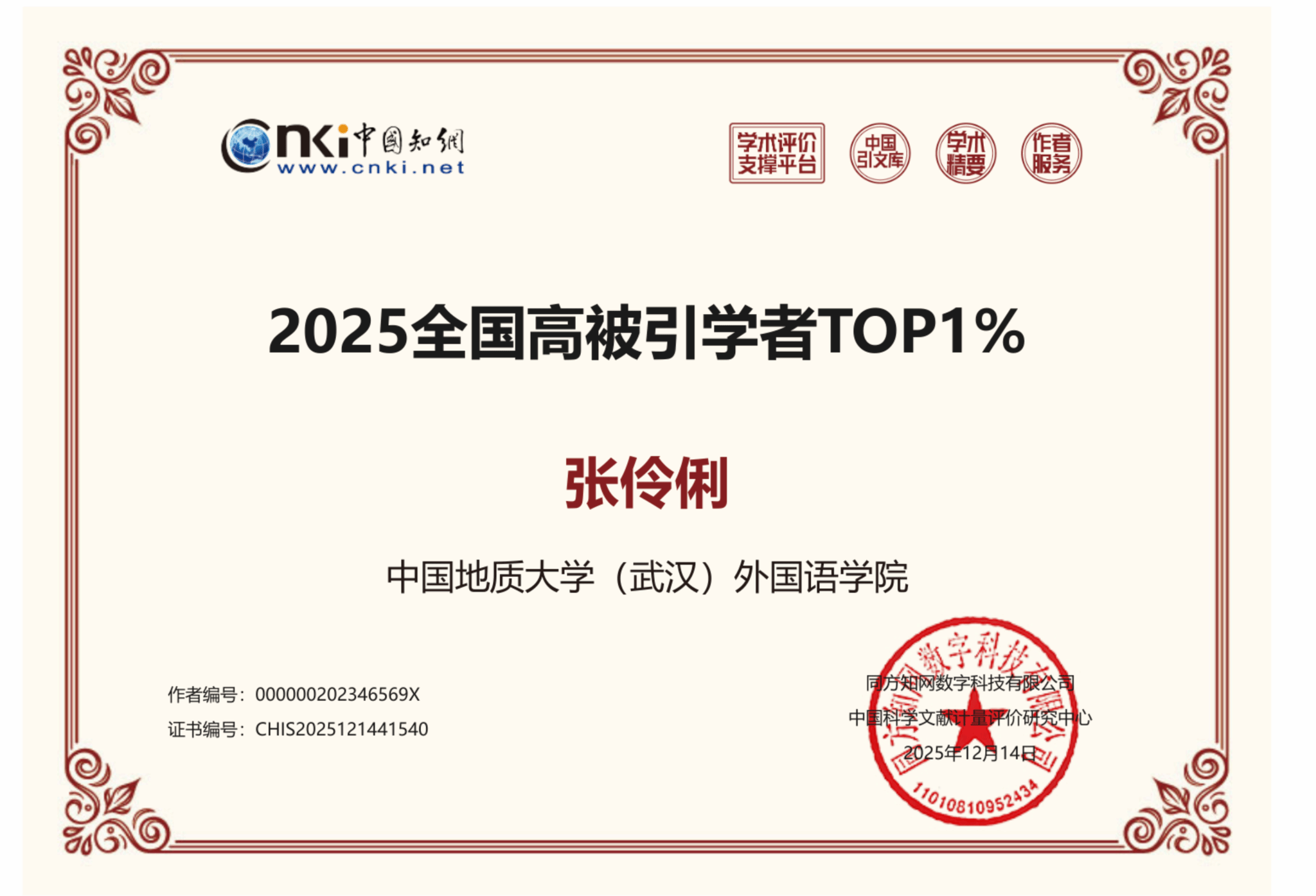 据悉,“2025全国高被引学者TOP1%”需满足以下条件:近十年发文的作者总PCSI 位于初选作者范围的TOP1%(共有学者3万人,基线值为31.815);且近十年发表PCSI高于理论平均值(1.65)的论文不少于5篇以及近十年至少发表1篇学术精要高影响力论文。其中,外国语言文学学科有325名学者入选。
