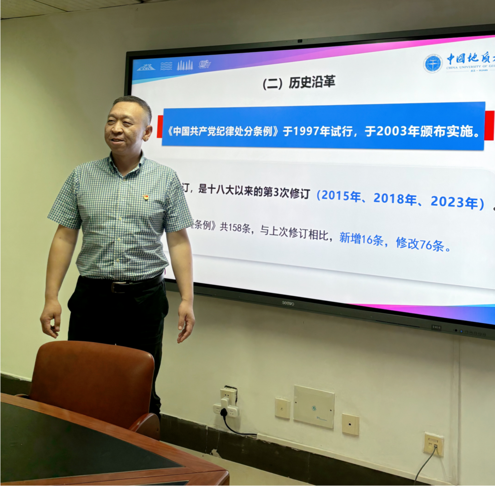 会议开始,张峻峰院长为同学们介绍了新修订的《中国共产党纪律处分条例》,分别从背景意义、历史沿革和使用原则三个方面向大家具体阐述了《中国共产党纪律处分条例》的整体发展情况。他带领团队成员们一起学习了条例的具体内容,从提供纪律保障、加强纪律建设和完善纪律规范三个维度归纳了党纪学习要点,为党员同学们指明了努力方向、奠定了理论基础,也给足了底气和信心。