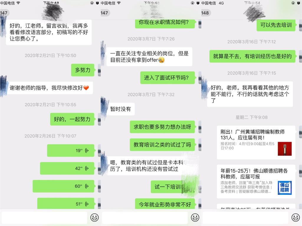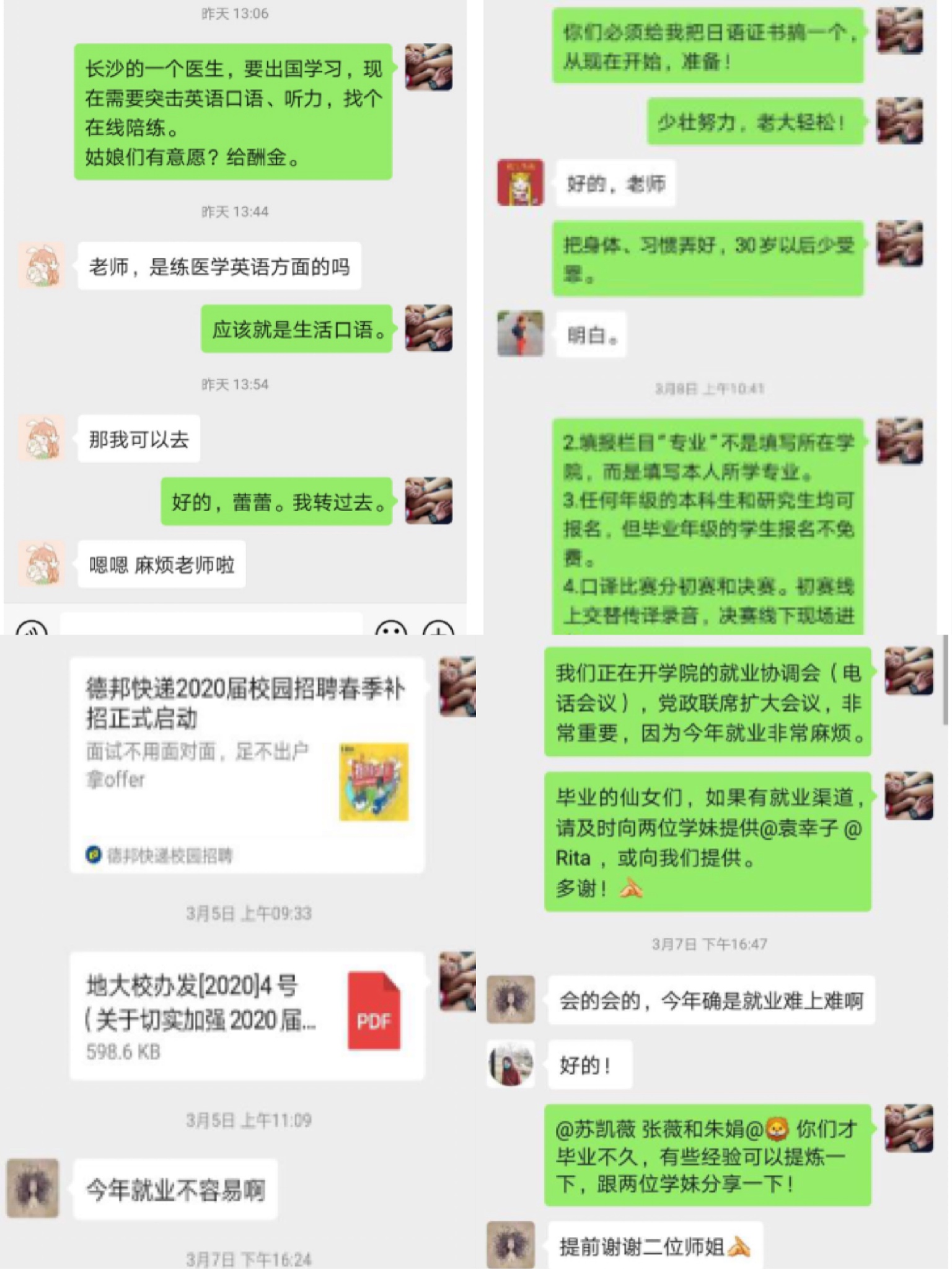 组织的网络双选会、空中宣讲会以及在线面试之外,导师们也都通过多种途径主动跟进毕业生就业意向、就业动态,不遗余力地寻找各类就业信息与途径,在自己有限的能力范围内尽最大可能帮助学生解决就业难题。王伟老师和汪卫红老师常在研究生群里发布专业相关招聘和培训信息。李孝奎老师通过电话与自己的研究生进行沟通,与研究生召开定期例会,就文献阅读,科研探索和实习实训等话题进行交流和指导。李老师今年的毕业研究生方同学面临着初步入职协议保底、签订意向协议、备战公务员考试等几种选择,目前疫情造成不少工作停滞,李老师在学生迷茫时常给予鼓励和建议。