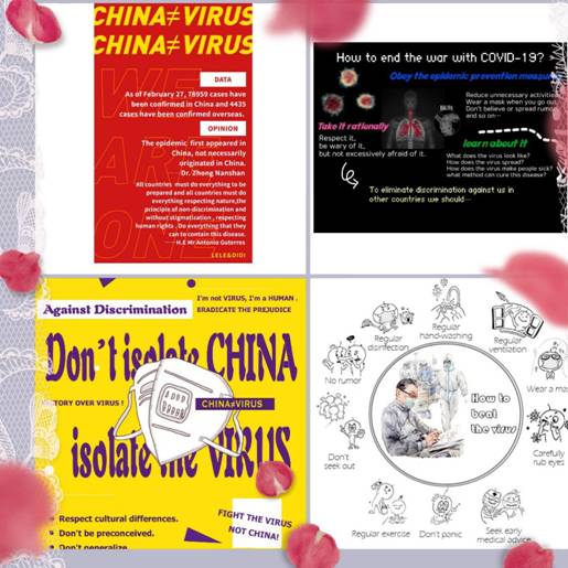 When talking about the prejudice and discrimination in the Cross-Cultural Communication Course, Ms. Li Pin mentioned that in the early stage of the epidemic, many countries mistakenly believed that the epidemic originated from China and had “prejudice” against China. Therefore, she asked students to make an official response to it through producing English posters themed by “Fight epidemic and reject discrimination”. This class assignment not only mobilized students’ enthusiasm to learn and use English, but also greatly enhanced their patriotism. With rich imagination and elaborate designs, students presented a series of posters featured with novel forms and rich contents.
