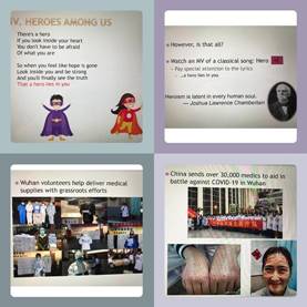 Integrating the theme of “Hero” into English teaching, Associate Professor Liu Min talked about various heroes from the famous people such as national heroes, great leaders and battle heroes in brilliant traditional Chinese culture to countless ordinary civilian heroes around us, like the hospital nurses, police officers, community volunteers, taxi drivers and couriers in the process of fighting the epidemic., By sharing the story of Cai Yankai, a student from 2019 ESS Experimental Class who donated many protective suits, Professor Liu enlightened the students with the ideas that “heroism is latent in every human soul” and “a hero is a man who does what he can!”. Thus, in such a special period, students should try their best to do everything well, and everyone can be the hero of themselves and others.